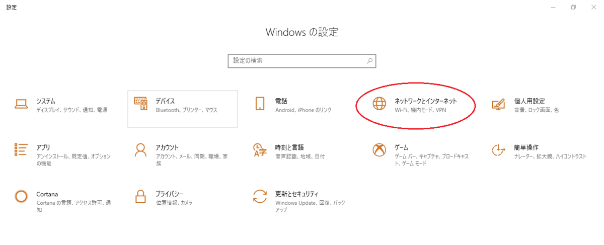 すると上のような画面が出てくるので赤枠の「ネットワークとインターネット」に進みます。